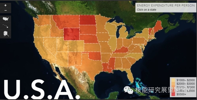 最后一张图奉送给大家的是美国各州人均年能源花费图。美国2012年的人均年耗能3052美元。