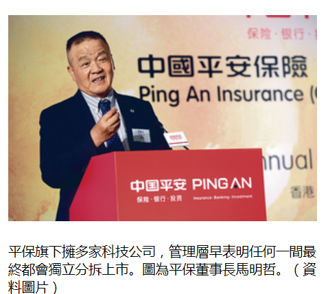 新浪港股讯 据香港经济日报报道,平保(02318)投资科技公司进入收成期,拟年内分拆旗下4间子公司在港挂牌,总估值高达6341亿港元;集团发言人对市场传闻不予置评。