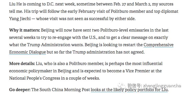 今天,鹤访美已经回到了国内。访美期间他会见了美国三位重要人物:财长姆努钦、白宫经委主任科恩和贸易代表莱特希泽。