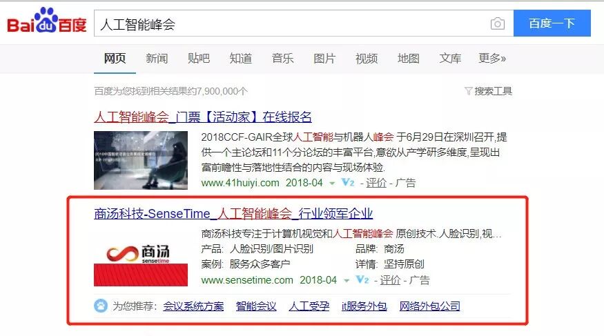 这家刚刚创下AI领域融资新纪录的公司,对这场活动有多重视?看看百度搜索广告和现场标语就知道了。 商汤不仅专门为这次大会买了竞价排名,还在现场醒目提示:员工不要占用现场座位。