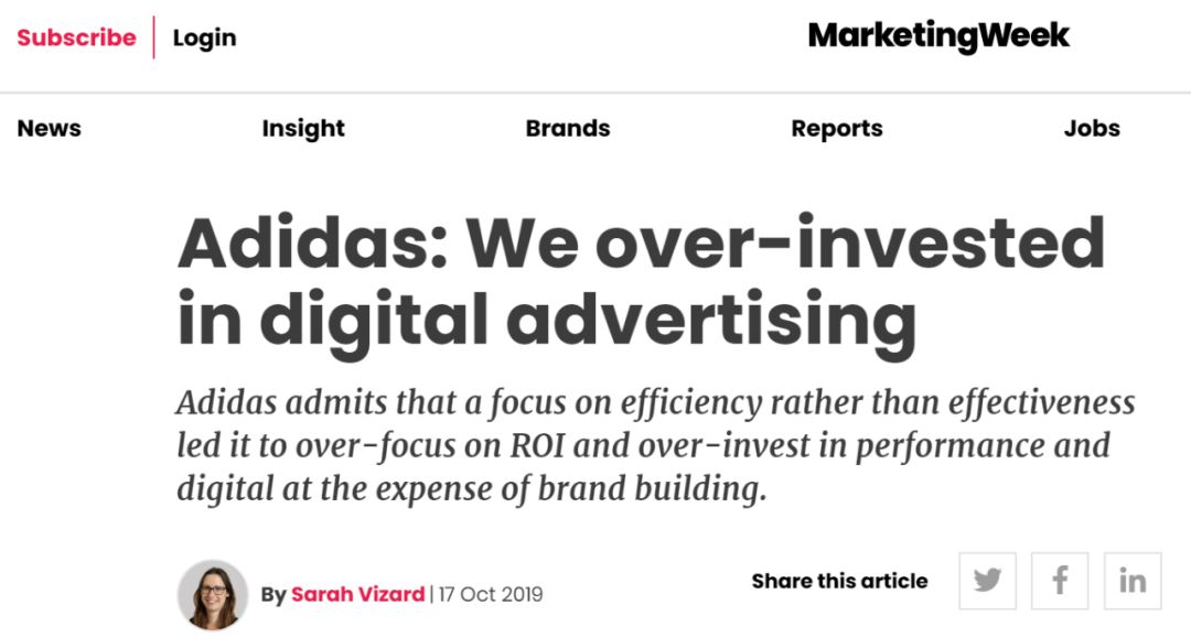 上周MarketingWeek报道了一条小新闻,虽然被大多数营销人所忽略,在我们看来其实应该是个营销圈的小小里程碑事件。这条新闻的标题是《阿迪达斯:我们在数字营销领域进行了过度投放》。姑且称之为:“阿迪达斯的自白”(Ad