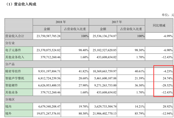 歌尔股份依靠电声器件起家,业务包括精密零组件(微型麦克风、微型扬声器、MEMS传感)、智能声学整机(有线/无线耳机、智能音箱等)和智能硬件(可穿戴电子产品、VR)三大板块。