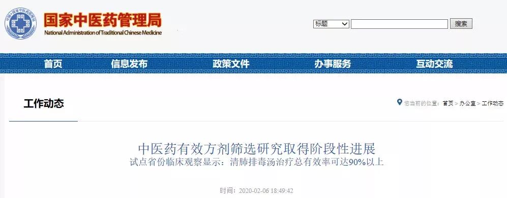 2月6日,中医药管理局发布公告:中医药有效方剂筛选研究取得阶段性进展,“清肺排毒汤”治疗新型冠状病毒感染的肺炎患者总有效率可达90%以上!
