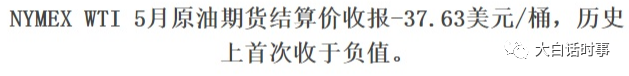 那就是作为地球上消费规模最大的商品之王“石油”,在今天凌晨居然跌到了负40美元,最后以负的37美元收盘。 换句话说,只要你不去投机WIT原油的5月合约,那么实际上昨晚的原油暴跌到负值,对你没有任何影响。
