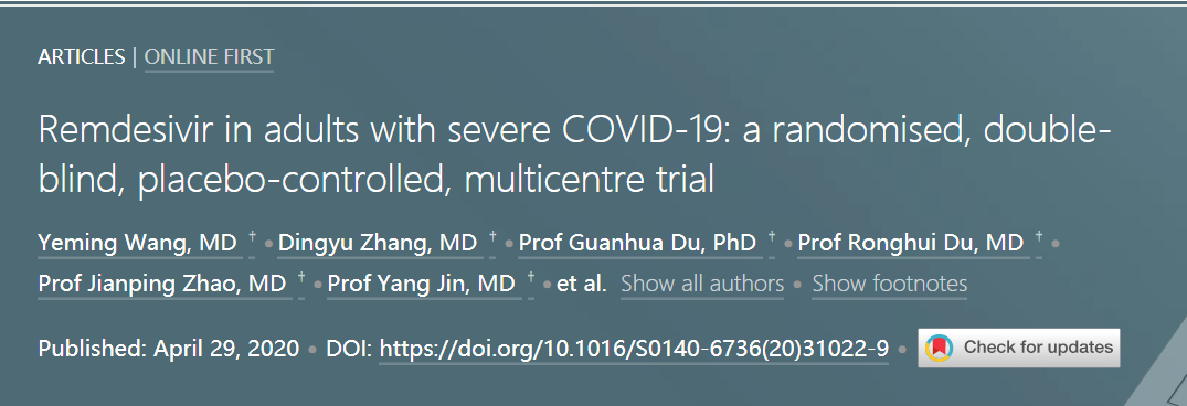 所属分类:转载 4月29日,柳叶刀发表了瑞德西韦治疗中国重症COVID-19患者的随机、双盲、安慰剂对照研究结果。 该研究(NCT04257656)在湖北的10家医院进行,入组标准为实验室确诊的SARS-CoV-2感染的成年患者,这些患者从症状发作