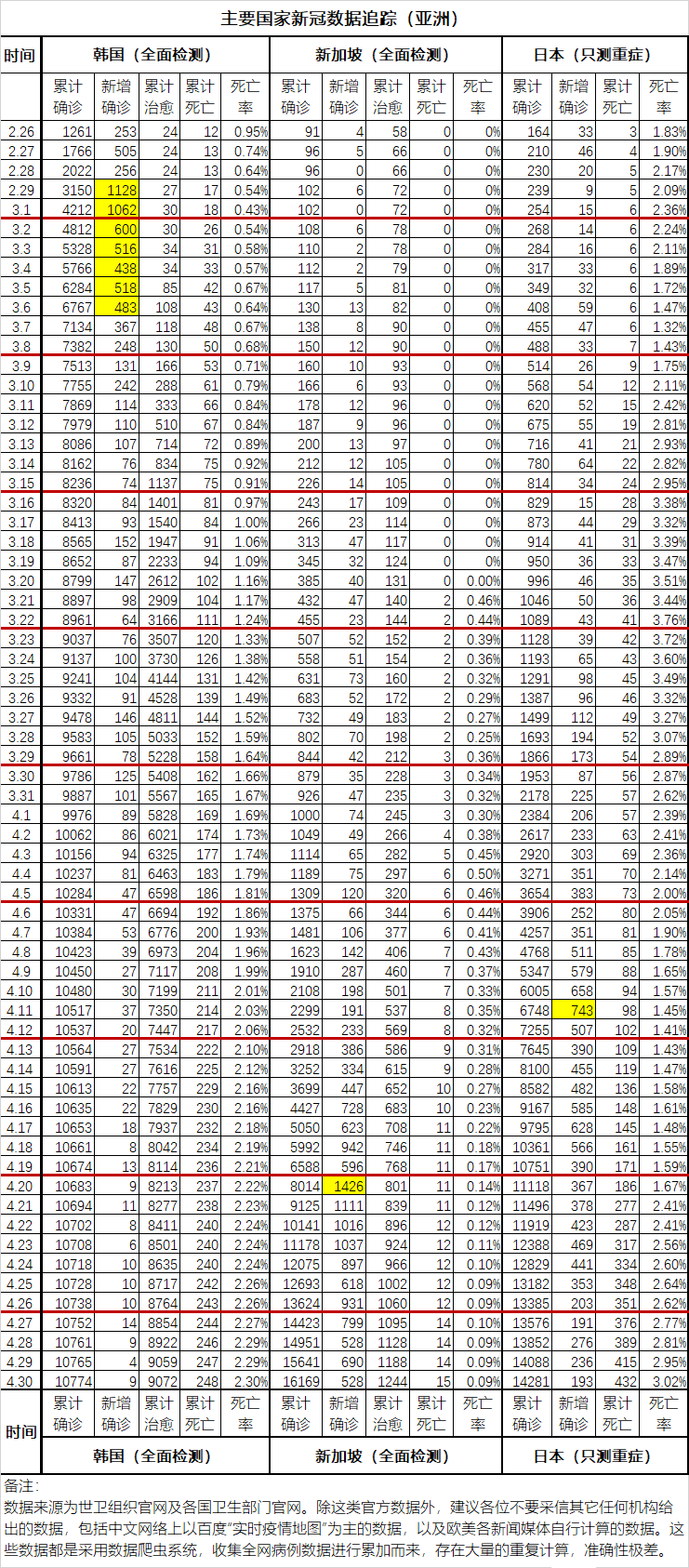 本文先从亚洲的韩国新加坡日本三国开始讲起。先给出结论:韩国已经完全没事了;新加坡把外籍劳工中的无症状患者全都筛了出来,其实早已没啥问题;日本的佛系抗病更是取得了令人震惊的成功。下面是这三国的数据表: