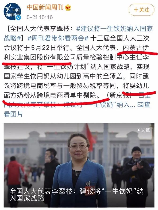 今年两会上,全国人大代表、伊利集团质量检验控制中心主任李翠枝建议,将“一生饮奶计划”纳入国家战略,实现国家学生饮用奶从幼儿园到高中的全覆盖,同时建议将跨境电商税率与一般贸易税率等同,将婴幼儿配方奶粉从