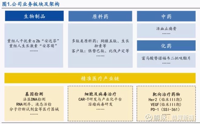 企业简介: 安科生物共有六块主营业务,分别为生物制品(公司核心产品生长激素及干扰素)、中成药(子公司余良卿)、化学合成药(子公司恒益)、原料药(子公司苏豪逸明)、技术服务(子公司中德美联)和其他业务。