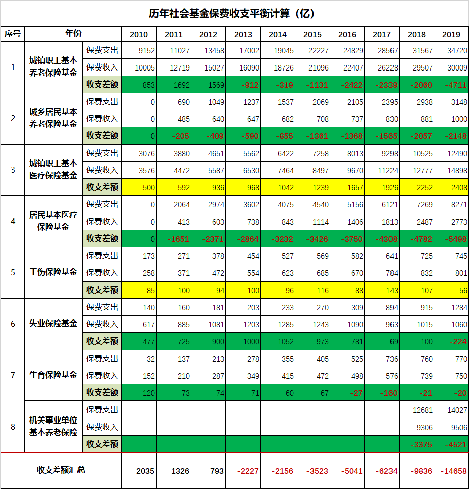 老读者都知道,追踪社保基金的整体收支情况,是本公号的一个经常性动作。首先给出数据表,数据来源为财政部发布的历年财政决算及社保基金决算报告。下表的阅读方法是这样的:收支差额这一行被涂为绿色的,表示该分项